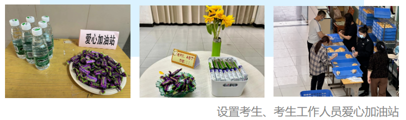同时,我校还为考生提供了周到的考试保障和温馨的考试环境。考试中心微信公众号转发开考提醒、推送考点考场指南,保卫部组织考生有序入校,现代教育技术中心全程技术保障,后勤部门保障考场环境、电力、餐饮等,校团委派出志愿者进行指引,校医院设置医疗点由医务人员全程值守等。由于考试时间较长,在一个下午要完成两科目的考试,从下午两点开考至晚上近七点才结束考试,中场休息时间仅有十五分钟。为方便监考老师和考生们及时补充能量,考试中心还考中考务办为监考老师提供饼干糖果等,在考场各楼层为考生设置“爱心加油站”,各项措施周到细致,用心用情服务,展现了广外温度,深受老师和考生的好评。